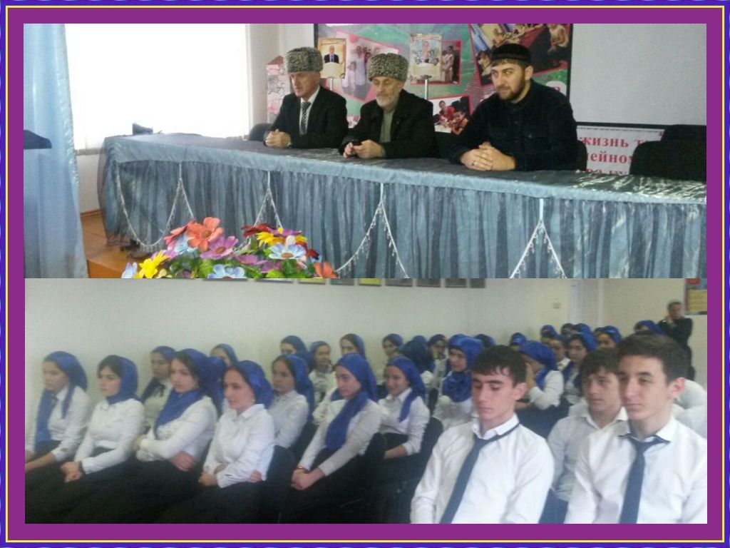 27.12.2014Во исполнение протокольного поручения Главы Чеченской Республики, Р.А. Кадырова, данных на совещании им на совещании от № 01-99 от 10.12.2014 года пункта № 1, 27 декабря с учащимися старших классов в актовом зале провели мероприятие с участием Имама поселка Ойсхар Джабирова Махмуда, который провел беседу по разъяснению значимости, величия и достойному празднованию Дня рождения Пророка Мухаммада(с.а.в.). Также в школе провели общешкольную линейку с учащимися и учителями с разъяснением величия наступающего священного месяца Рабиуль-авваль, в котором родился Пророк Мухаммад (с.а.в.). Организатор по ДНВ: Денисултанов М.Х.