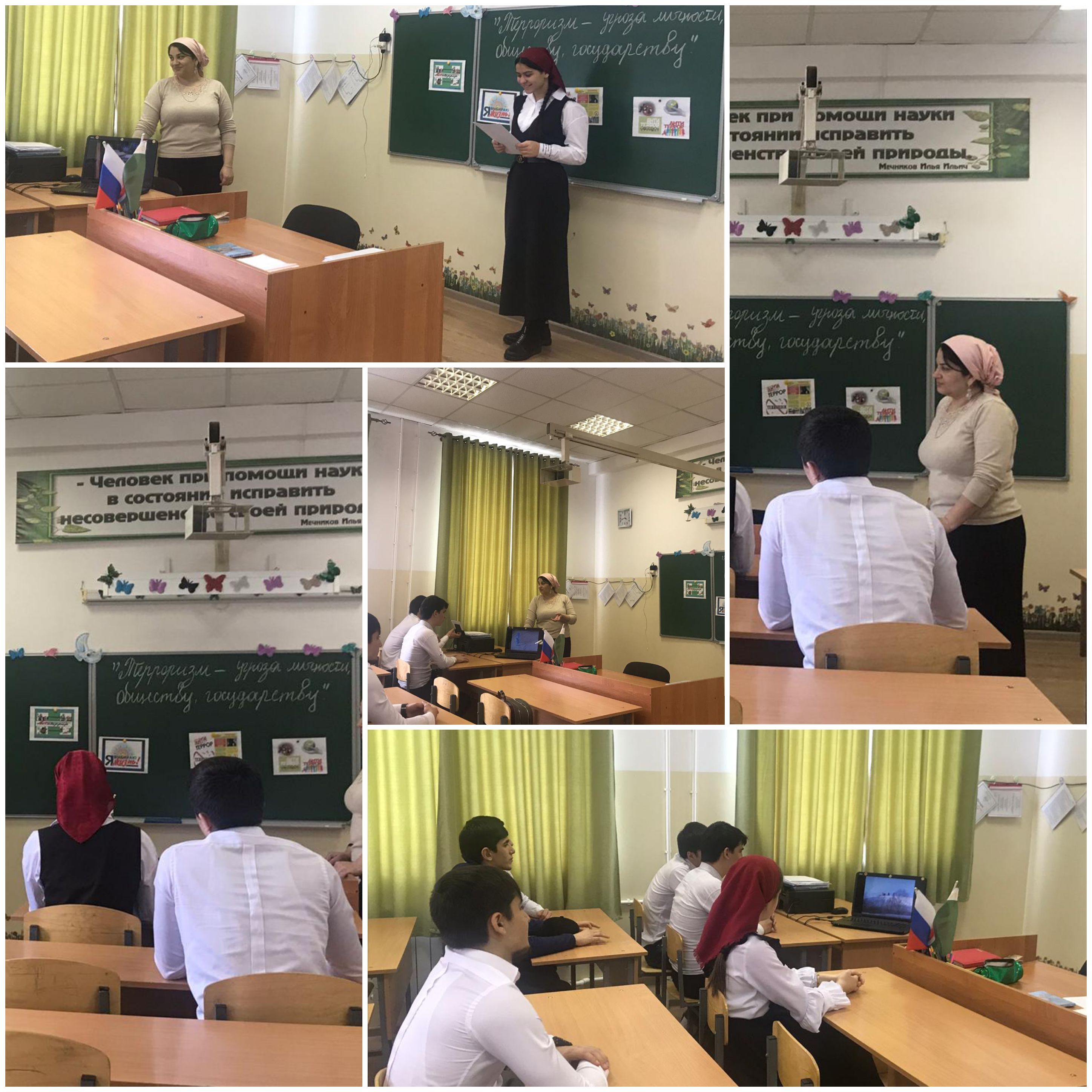 Учитель расказывала о том что, терроризм оказывает негативное влияние на все стороны общественной жизни страны. Важнейшей предпосылкой эффективной борьбы с терроризмом наряду с мерами спецслужб, является умение граждан противостоять.