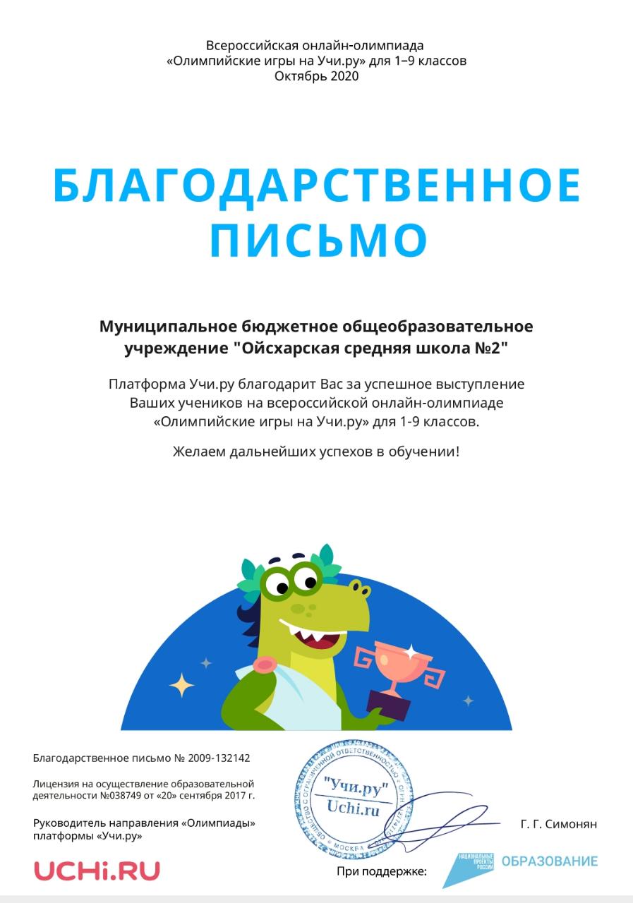 Благодарственное письмо от платформы Учи.ру за успешное выступление наших учеников на всероссийской онлайн-олимпиаде«Олимпийские игры на Учи.ру» для 1-9 классов.